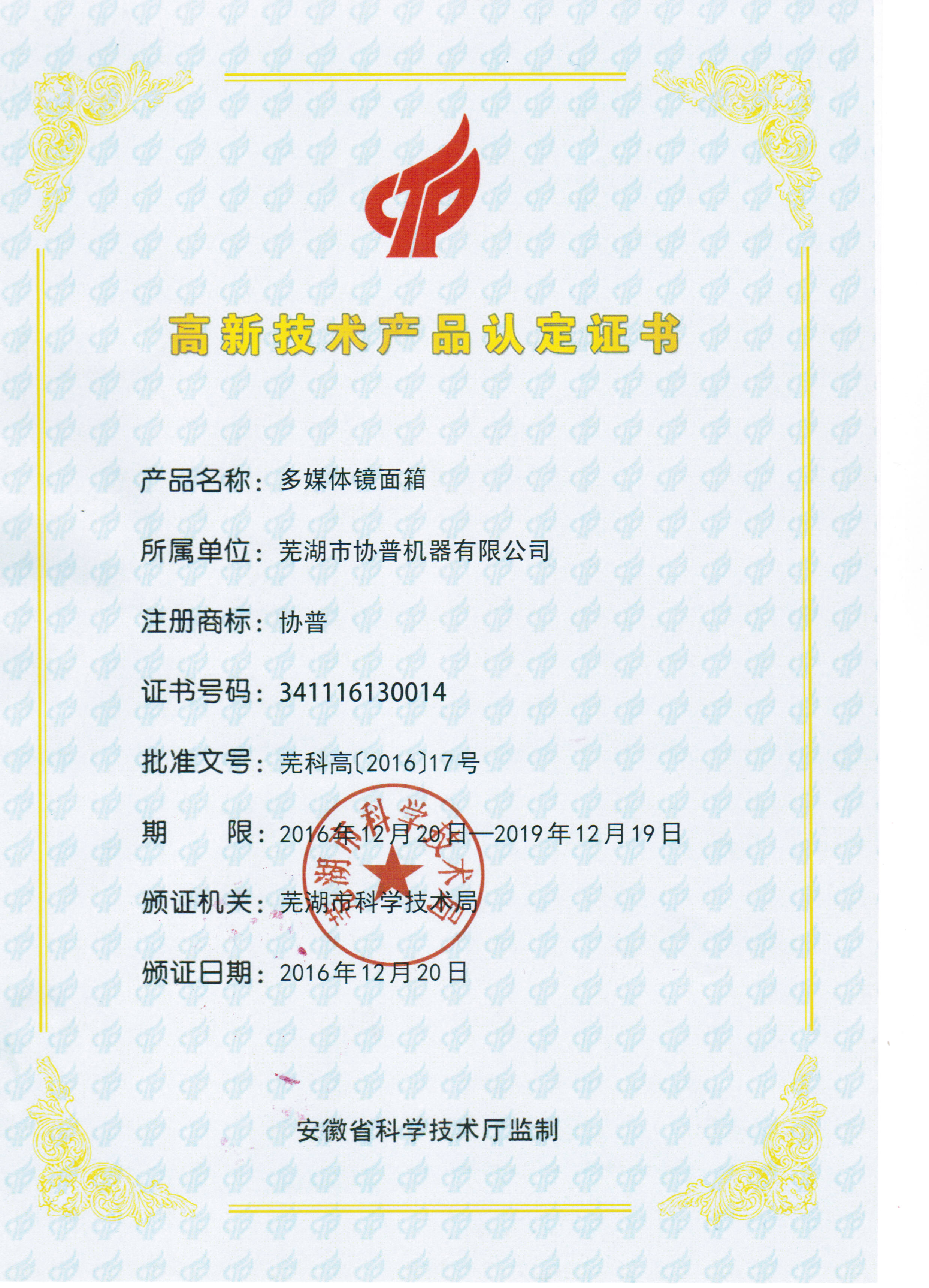 2016年9月,為提高產(chǎn)品知名度,我公司將一款新型高技術(shù)產(chǎn)品申報(bào)安徽省高新技術(shù)產(chǎn)品,經(jīng)安徽省科技廳專(zhuān)家評(píng)審,于2016年12月正式通過(guò)審核。